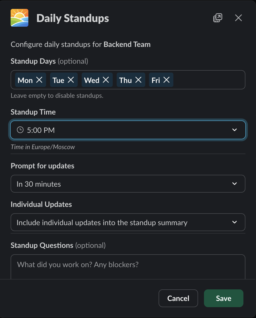 Choose which days of the week and what time prompts are sent. See Standup Settings for details.