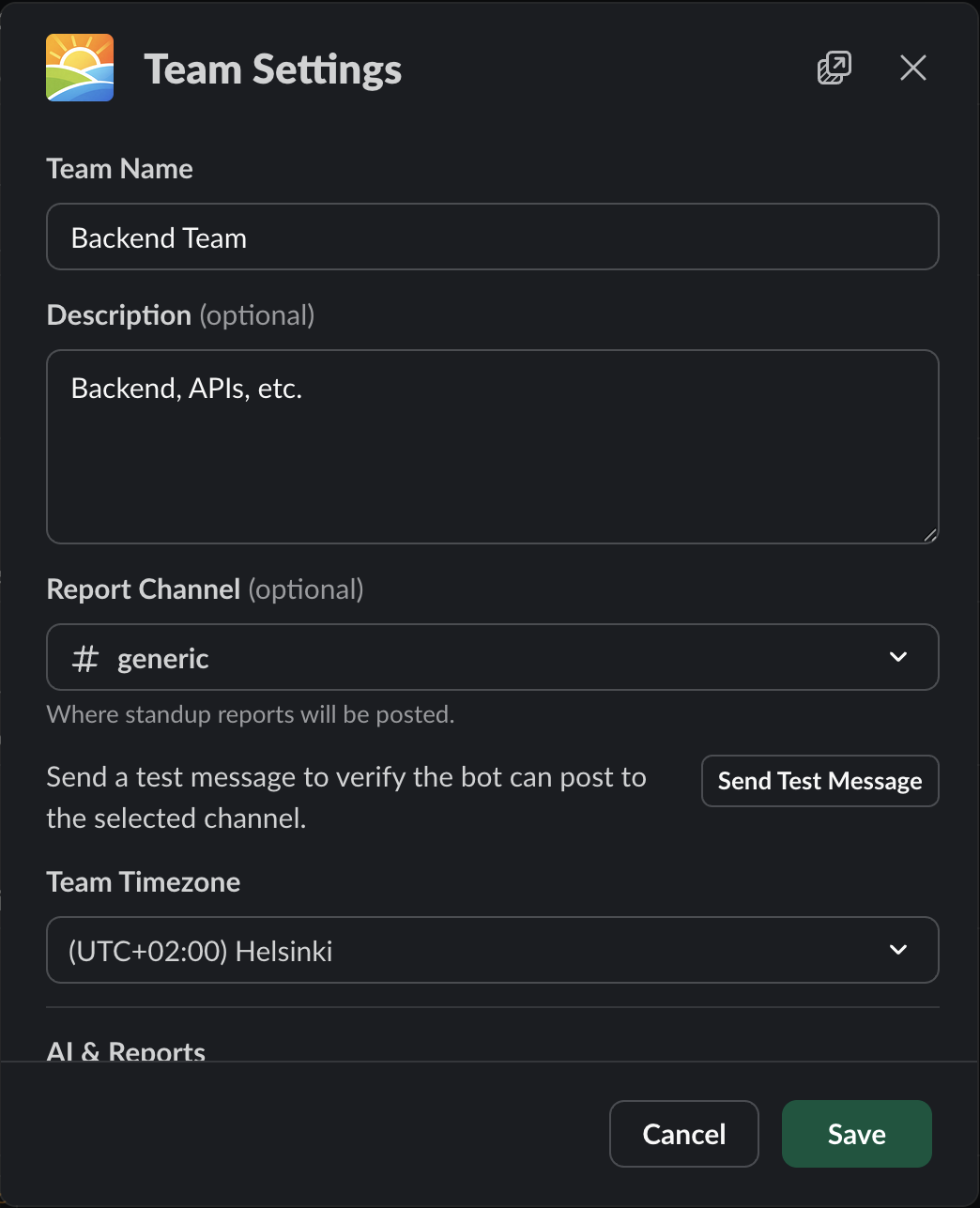 Team configuration is split across two modals, both accessible from the overflow menu on your team card in the App Home tab.