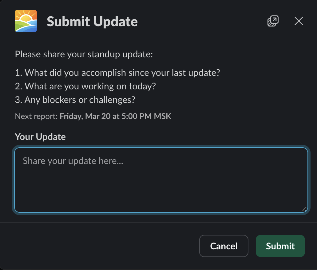 Members can submit updates at any time using the slash command or App Home, not only in response to a prompt.